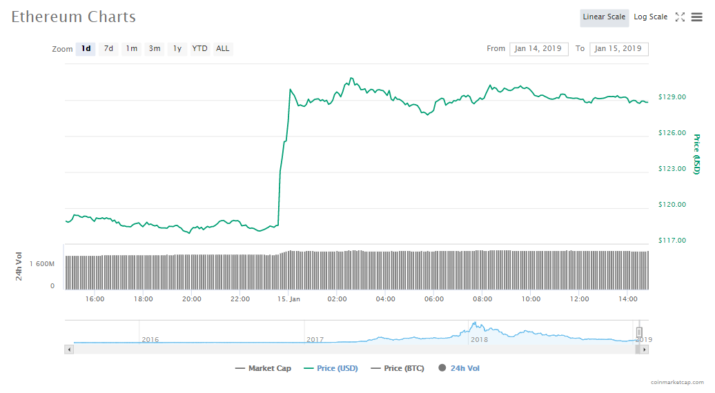 Ethereum’s price has jumped up by 8.35% today and its trading at $128.93 per token. Its capitalization is now $13.45 billion with trading volumes at $2.72 billion.