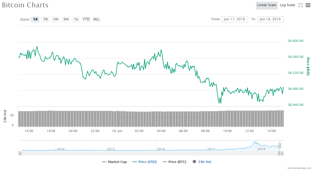 In the last 24 hours, Bitcoin slid 1.13% to $6488.37. Trading volume in BTC dropped to $3.27 billion and the value of the crypto fell to $110.70 billion.