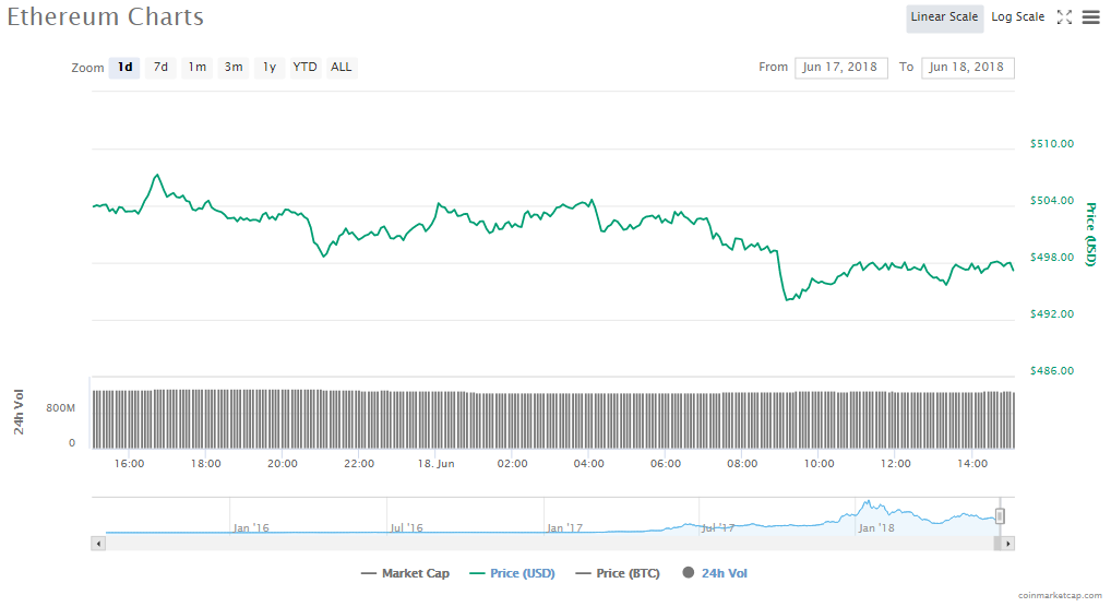 Ethereum slid 1.33% to its current price of $497.21. Trading volume in the last 24 hours has dropped to $1.27 billion and Ether’s market cap also slipped to $49.75 billion.