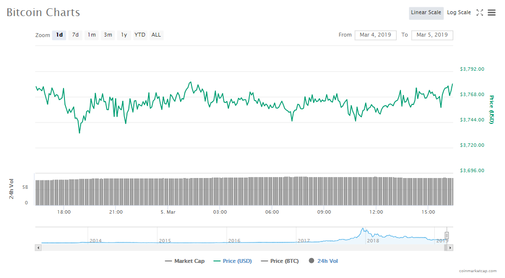 The price of Bitcoin is up by 0.12% to trade at $3781.22. The capitalization of BTC is $66.44 billion and volumes of trade are $8.67 billion.