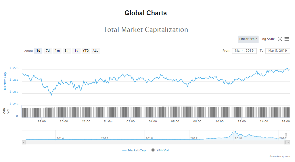 The cryptocurrency market’s valuation is $127.12 billion and volumes of trade are $27.43 billion.