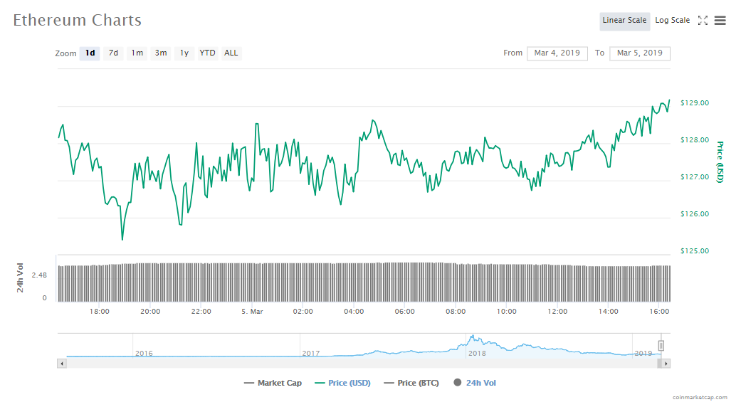With a 0.53% gain in its token price, Ethereum is trading at $128.94, finally breaking the steady declines the crypto has been going through for the last week. Capitalization is at $13.55 billion and trade volumes are $3.74 billion.
