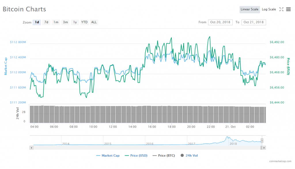 In the past 24 hours, Bitcoin jumped 0.23% to trade at $6,476.40. The leading cryptocurrency’s trade volume trickled to $3.44 billion, while its market slid to $112.52 billion.