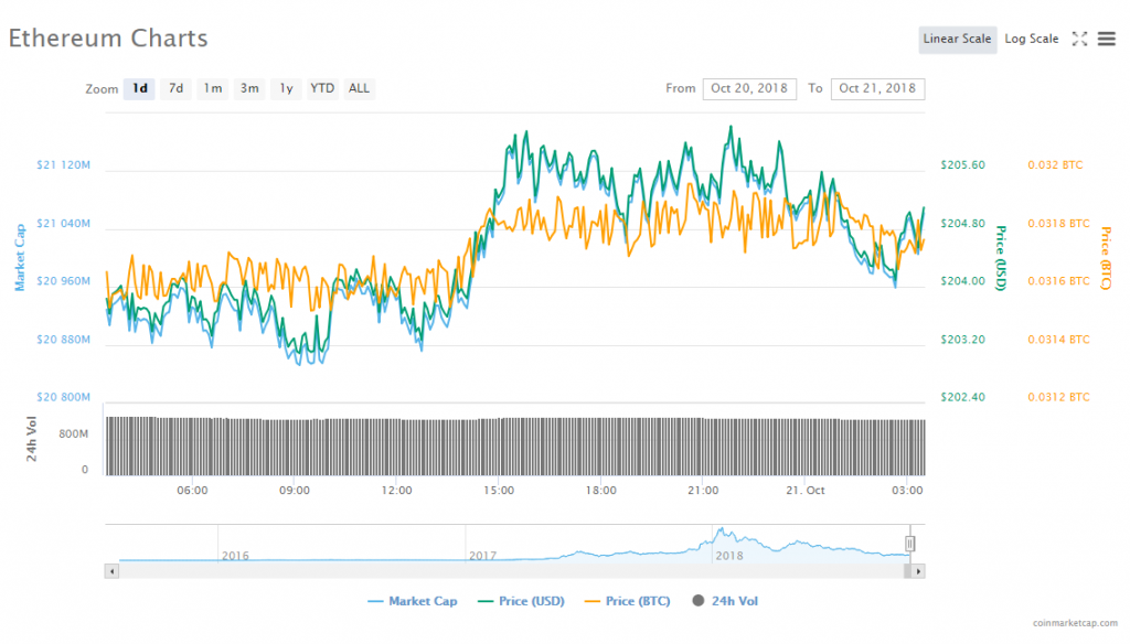 Ethereum’s price jumped 0.65% to trade at $205.28. As for the altcoin’s trading volume, it reached $1.25 billion; whereas its market capitalization hit $21.08 billion.