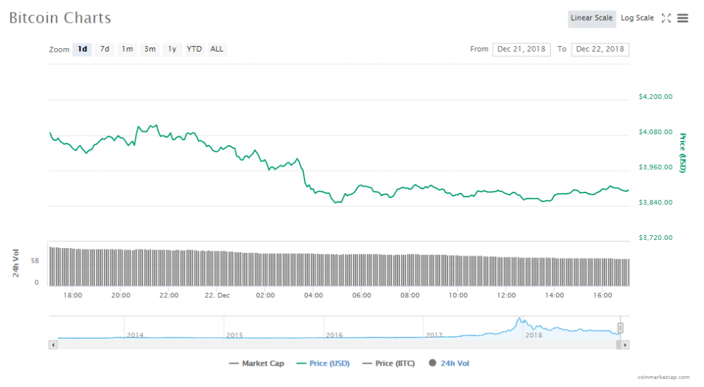 Bitcoin once again has slipped below $4k to trade at a price of $3897.73, which is a 3.97% drop since yesterday. Capitalization of the crypto is now at $69.96 billion and trading volumes are $6.14 billion.