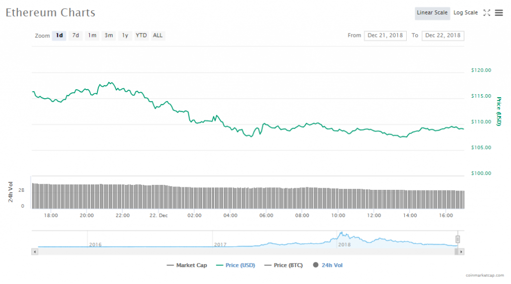 Ether is down by 4.97% since yesterday to trade at a price of $109.47 billion. The altcoin’s market value is down to $11.37 billion and trading volumes are $2.24 billion.