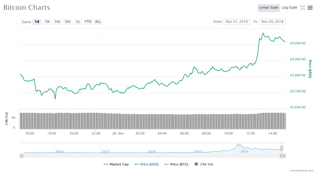 Bitcoin has finally climbed up above the $4000 mark and is trading at $4020.32, a 6.43% increase since yesterday. Capitalization of the digital asset is $69.94 billion and trading volumes are currently $6.46 billion.