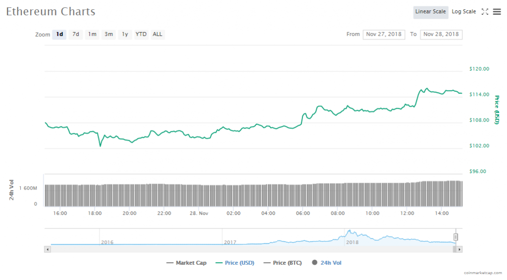 • Ethereum’s trading at $115.02, rising by 7.48%. The digital currency is now worth $11.90 billion.