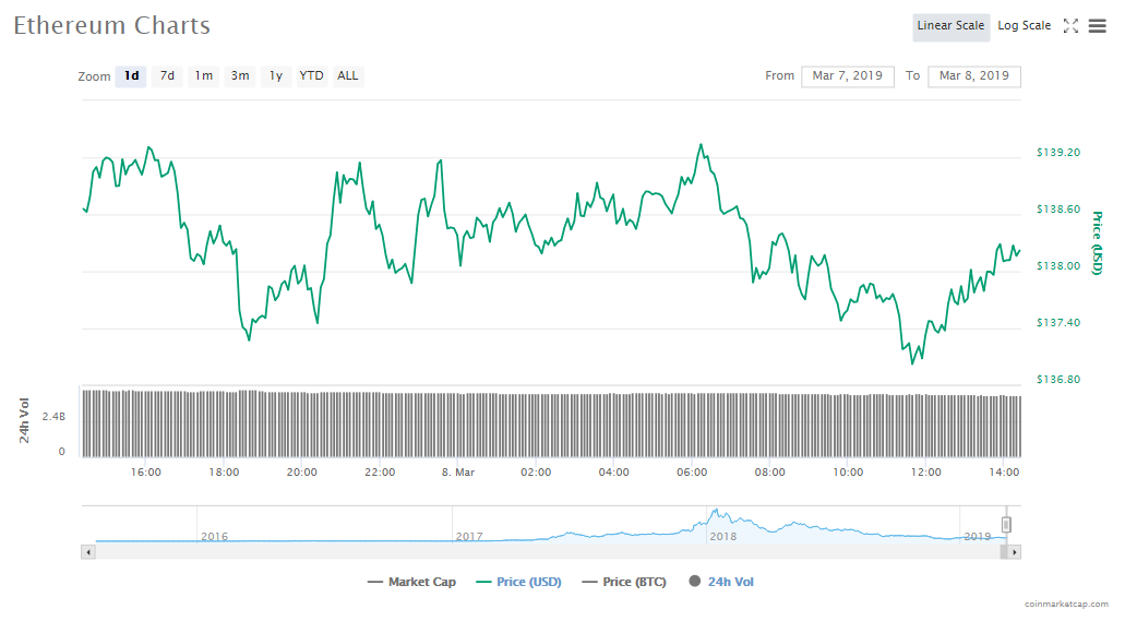 Ethereum’s price in the last 24 hours has slipped by another 0.43% to $138.66. Capitalization for the altcoin is $14.57 billion and trade volumes are $4.20 billion.