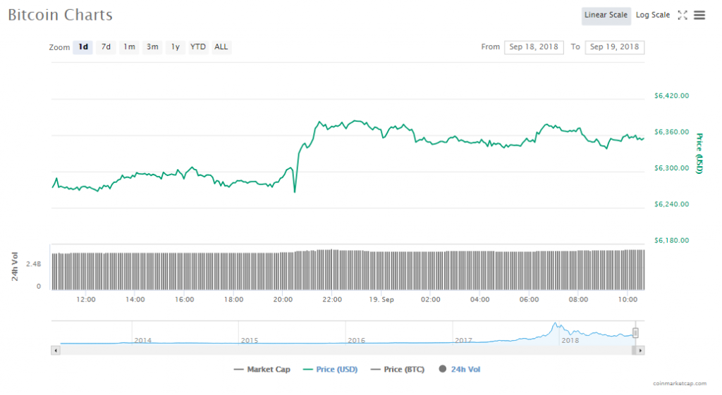 Bitcoin’s price is now $6354.71, gaining 0.93% since yesterday. Bitcoin’s market value is $109.83 billion and its trading volumes are $4.26 billion.