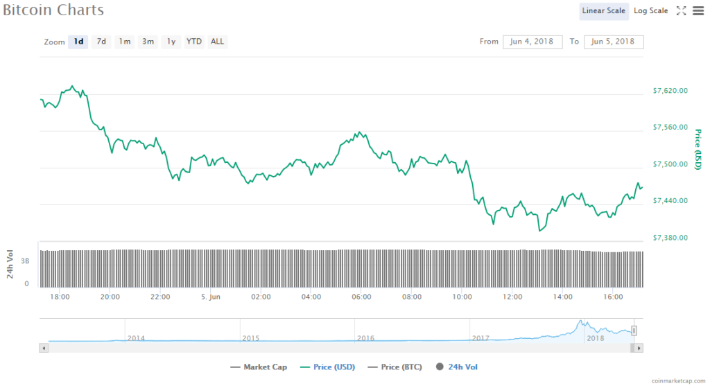 Bitcoin fell 2.32% in the last 24 hours to trade at $7452.61. The trading volume in BTC is $4.73 billion and its market cap is $127.21 billion.