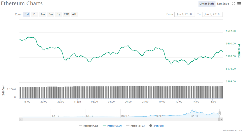 Ethereum lost 2.55% since yesterday to trade at $592.91. Trading volume is $1.88 billion and ETH’s market value is $59.38 billion.