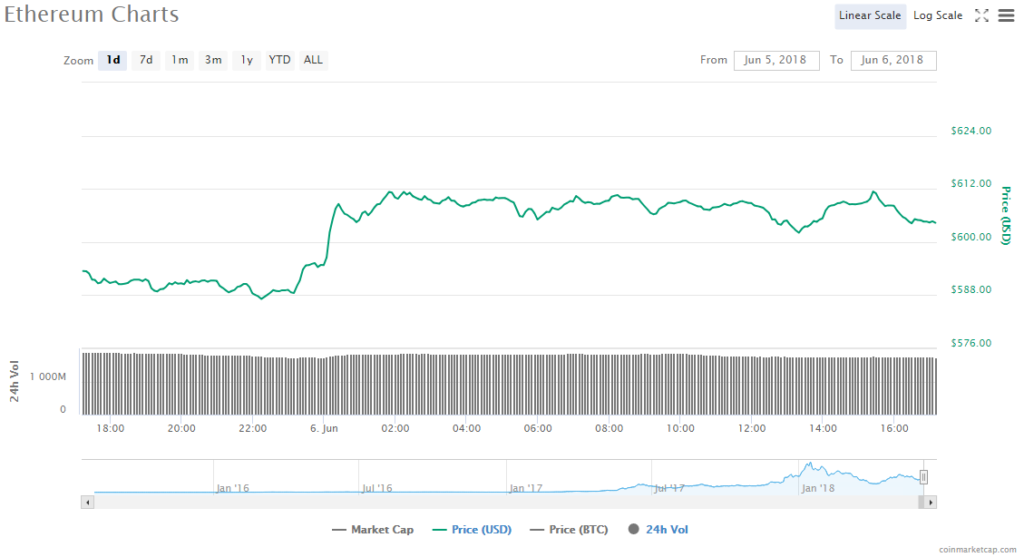 - Ethereum’s price went up 1.93% to $604.36 and its market capitalization is $60.36 billion.