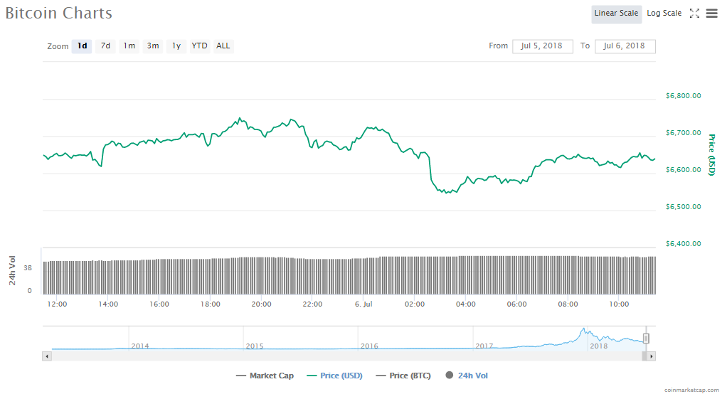 Bitcoin’s price fell by 0.68% to trade at $6638.80 per token today. The world’s number one crypto’s trading volume is at $4.89 billion and its value in the market is $113.89 billion.