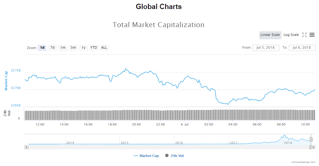 The virtual currency market’s trading volume is now at $15.64 billion while its capitalization has dropped to $269.5 billion since yesterday.