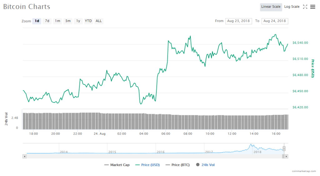 Bitcoin’s price is now $6540.33, a jump of 1.25% in the last 24 hours. The market value of BTC is now $112.79 and its trading volume is $3.53 billion.
