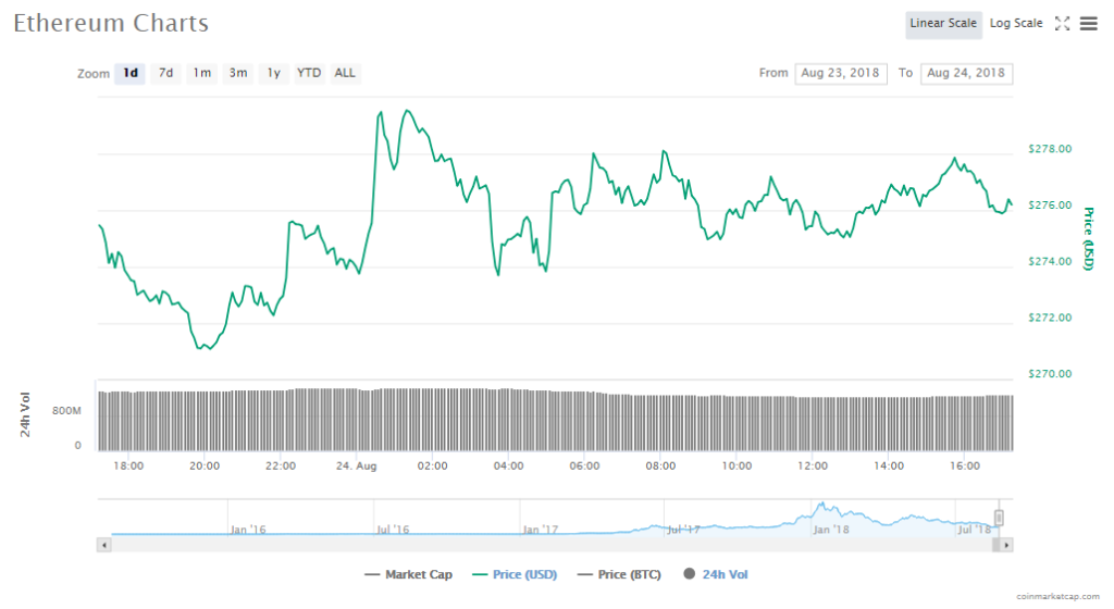 Ethereum’s price rose by 0.48% to its current price of $275.89. The trading volume in the digital asset is currently $1.27 billion and its market value has gone up to $28.04 billion.