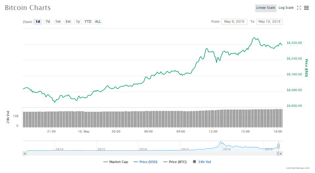 • Bitcoin’s trading at $6314.03, rising 3.75%. This crypto’s worth in the market is now $111.70 billion.