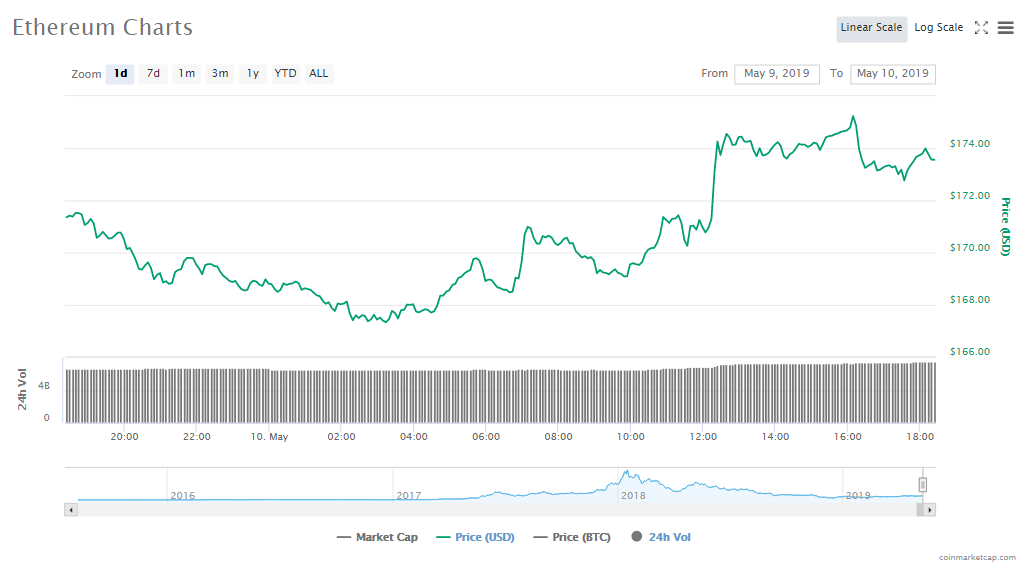 The price of Ethereum has gone up by 1.52% and is now trading at $173.76. Capitalization for the altcoin is $18.42 billion. Trading volumes are $7.46 billion.