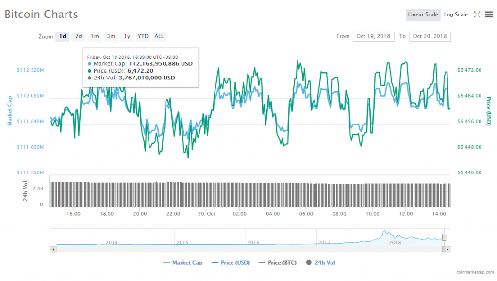 In the past 24 hours, Bitcoin jumped 0.10% to trade at $6,471.12. The leading cryptocurrency’s trade volume trickled to $3.61 billion, while its market slid to $112.15 billion.