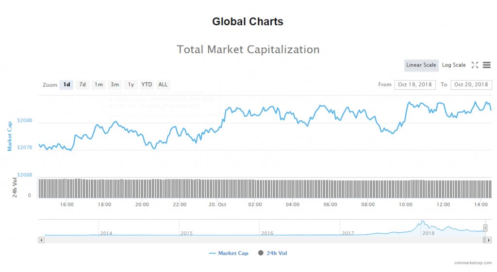 The volume of trade in the crypto market sat at $10.56 billion. The market’s capitalization, on the other hand, reached $208.89 billion.