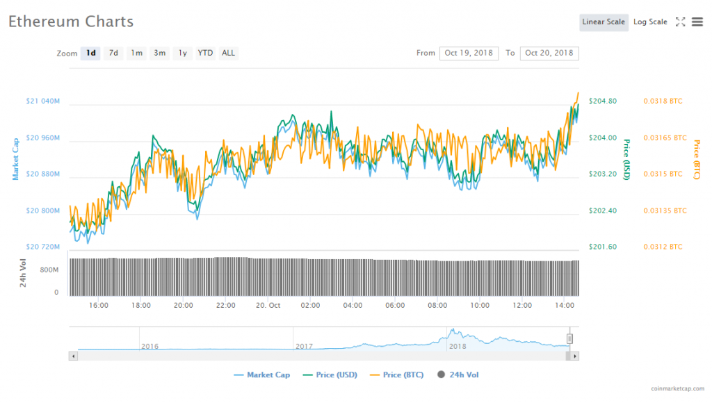 Ethereum’s price jumped 1.23% to trade at $204.81. As for the altcoin’s trading volume, it reached $1.28 billion; whereas its market capitalization hit $21.03 billion.