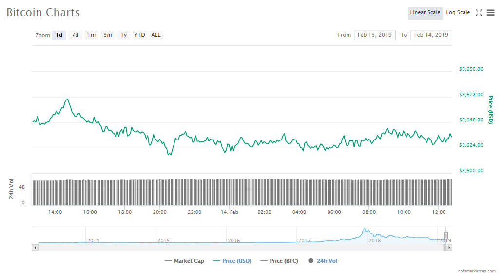 Bitcoin’s price has marginally slipped once again by 0.41% to its current $3637.82. The market worth for digital asset is now $63.79 billion and trade volumes are at $6.58 billion.
