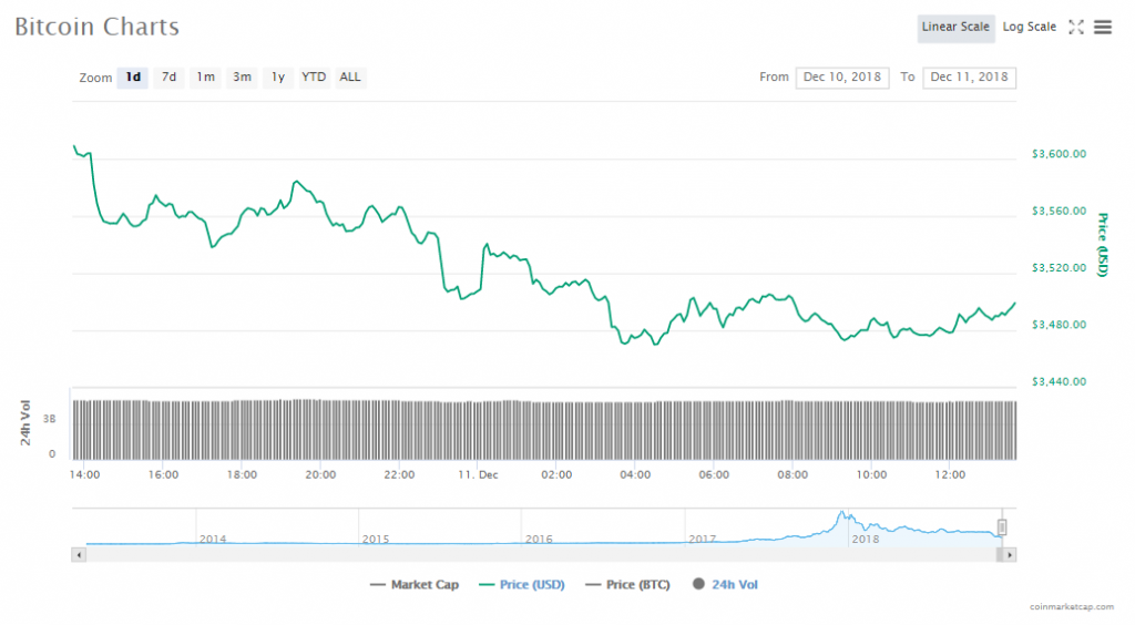 Bitcoin’s trading price is now $3505.43 per token, a 2.30% drop from yesterday. The cryptocurrency is seeing trading volumes of $4.94 billion and its market cap right now is $61.05 billion.