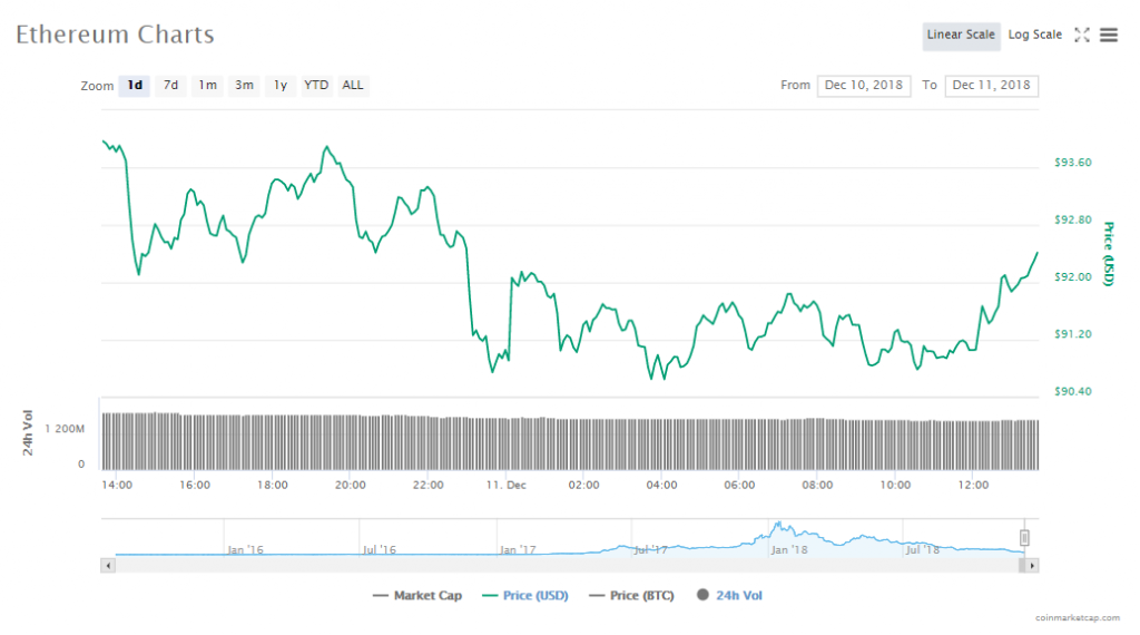 Ethereum’s token price is now $92.67, which is a 0.87% drop from yesterday. The altcoin’s trading volumes are at $1.67 billion and its market capitalization is $9.61 billion.