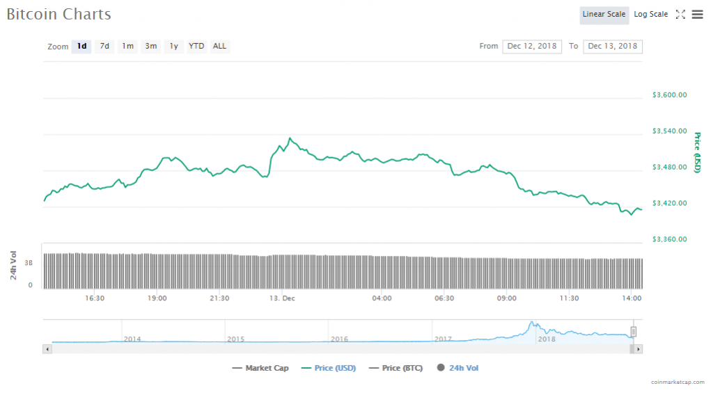 The world’s number one cryptocurrency continues to inch downwards, losing another 0.69% of its token price to trade at $3417.23. Bitcoin’s capitalization at the moment is $59.52 billion and is experiencing trading volumes of $4 billion.