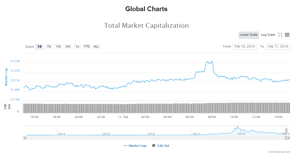 After big gains over the weekend, the surge is now subsiding and the cryptocurrency market’s capitalization is now $121.29 billion. Trading volumes are at $20.72 billion.