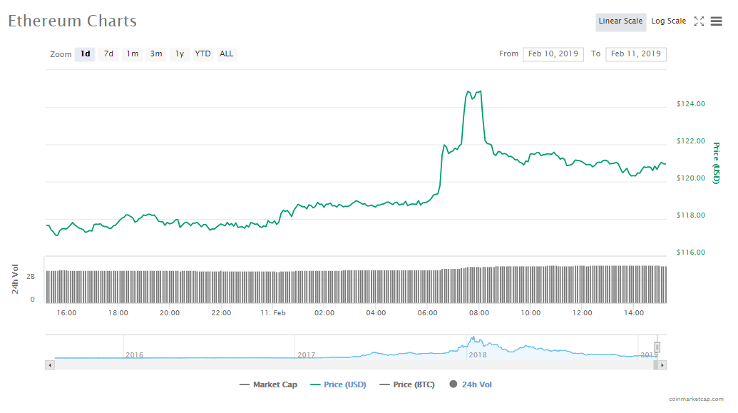 Ether’s price is up by 2.46% in the last one day to trade at $120.99. The market capitalization of the token is now $12.68 billion and it is experiencing trade volumes of $3.18 billion.