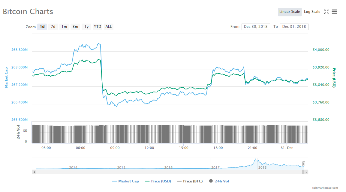 • Bitcoin’s market price fell 0.37% to $3,879.18, and its value in the market is $67.65