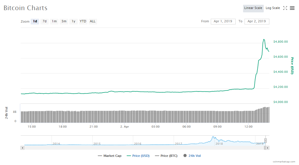 On Tuesday, at 04.32 UTC, the price of the most valuable cryptocurrency in the world, Bitcoin shot up by 17% to trade at $4715 per token. The digital asset’s price shot up even further by 0.525 UTC, when it was trading at $4926 a token, a 19.17% increase over a 24-hour period.
