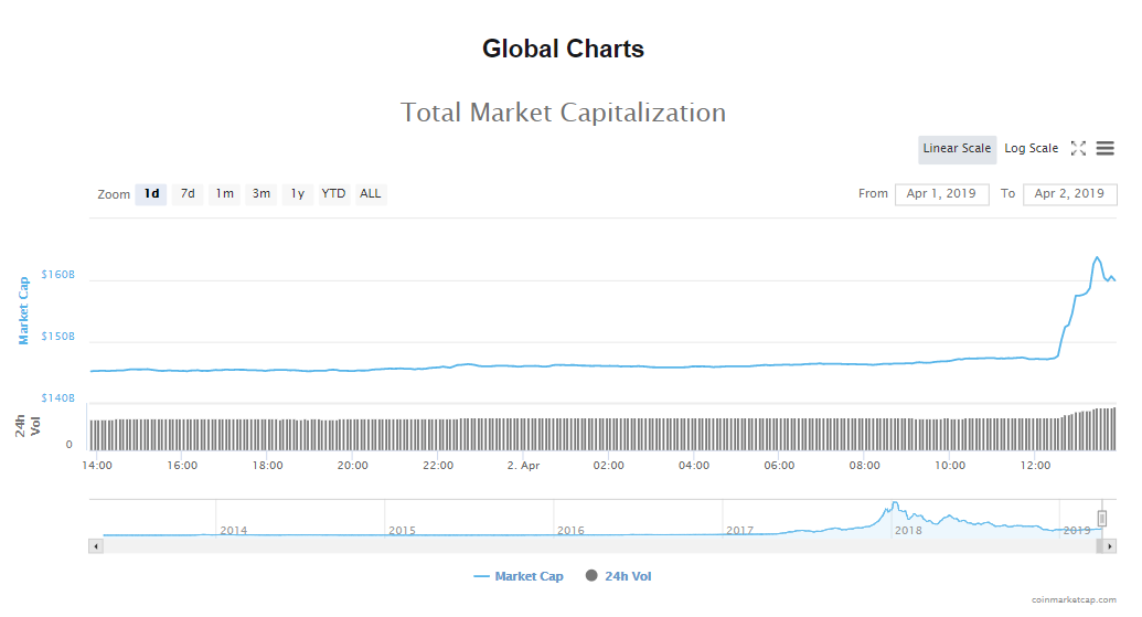 The capitalization of the crypto market shot up by more than $14 billion in the last 24 hours and is now at $159.39 billion. Trading volumes are at $45.08 billion.