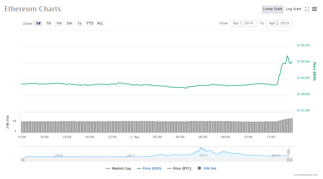 In the last 24-hour period, the price of ETH has soared by 5.40% to trade at $150.02 per token. Its capitalization is currently at $15.82 billion and is facing trading volumes $5.79 billion.