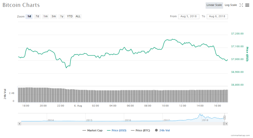 - Bitcoin lost 0.3% to a current price of $7008.19. The token’s market value is now $120.49 billion.