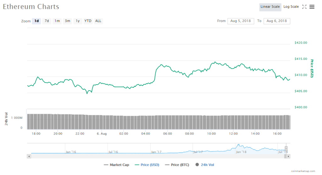Ethereum’s price gained 0.34% to trade at $408.61. Trading volume for the altcoin was $1.40 billion and its market value is $41.33 billion.