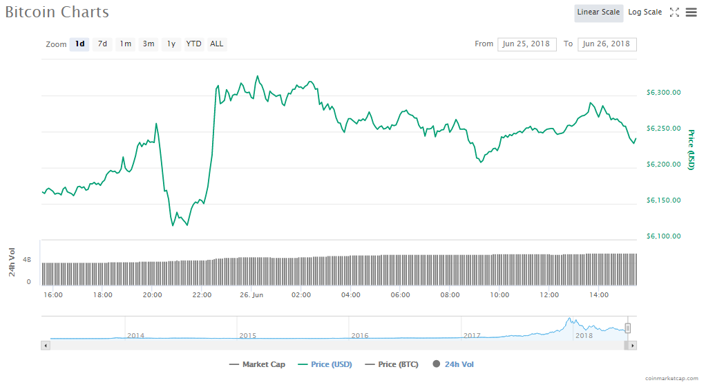 Since yesterday, BTC’s price has gone up by 1.14% to trade at $6240.48 per token. The asset’s trading volume is at $5.71 billion and its market value is now $106.91 billion.