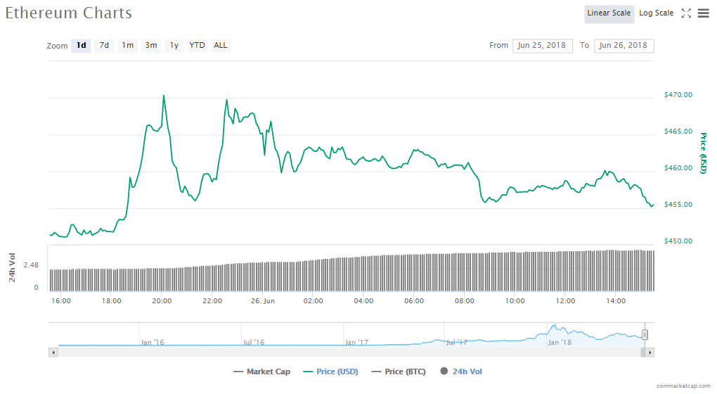 Since yesterday, Ethereum’s token price went up by 0.86% to $455.46. ETH’s trading volume is $4.28 billion and its market capitalization is $45.70 billion.