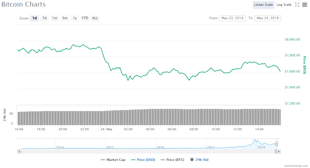 - The price of Bitcoin’s dropped 4.62% to $7618.55. Its market value is $129.60 billion.
