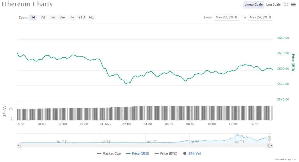 Ethereum’s price dropped 4.62% to $600.48 in the last one day. Trading volume in ETH is $3.04 billion but its market value is $59.29 billion.