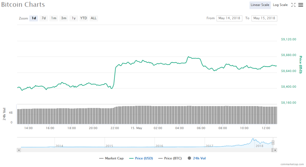 BTC’s price has gone up once again $8740.77, a gain of 4.03% from the same time yesterday. Trading volume went up marginally to $7.1 billion, and the digital token’s market value rose to $148.94 billion.