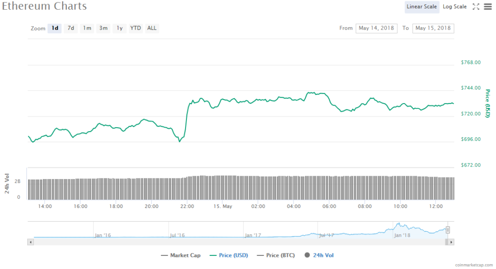 Ethereum’s price gained 4.05% to trade at $731.73 in the last 24 hours. ETH’s trading volume is now $2.82 billion and its market value has reached $72.67 billion.