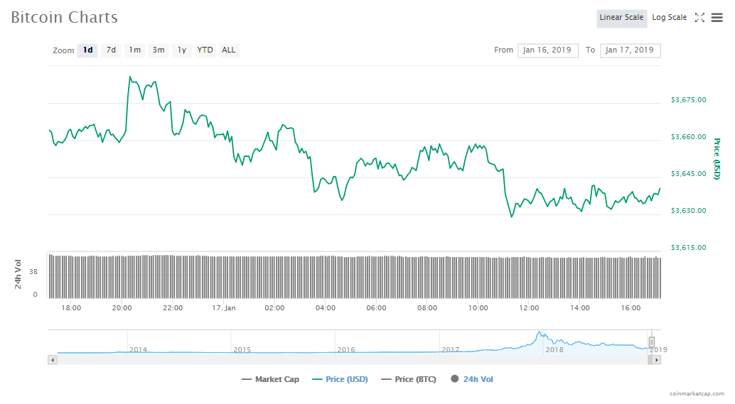 • Bitcoin’s price is $3642.88, down 0.25%. Currently, the asset’s market value is $63.69 billion.