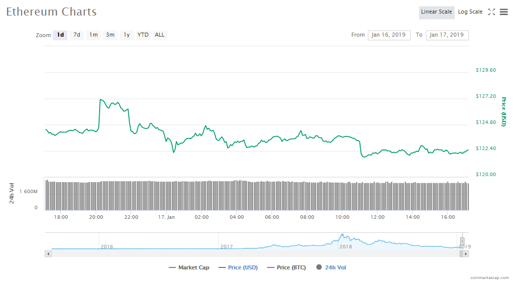 Ethereum is down 0.67% since yesterday to trade at a price of $122.57, with a market cap of $12.79 billion. The virtual asset’s volume of trade is at $2.65 billion.