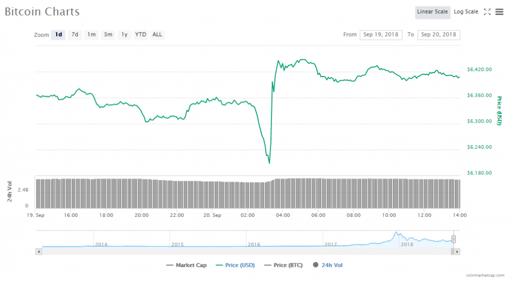 Bitcoin’s price is $6407.66, raising by 0.83% since yesterday. Bitcoin’s market capitalization is $110.73 billion and volumes are currently at $4.30 billion.