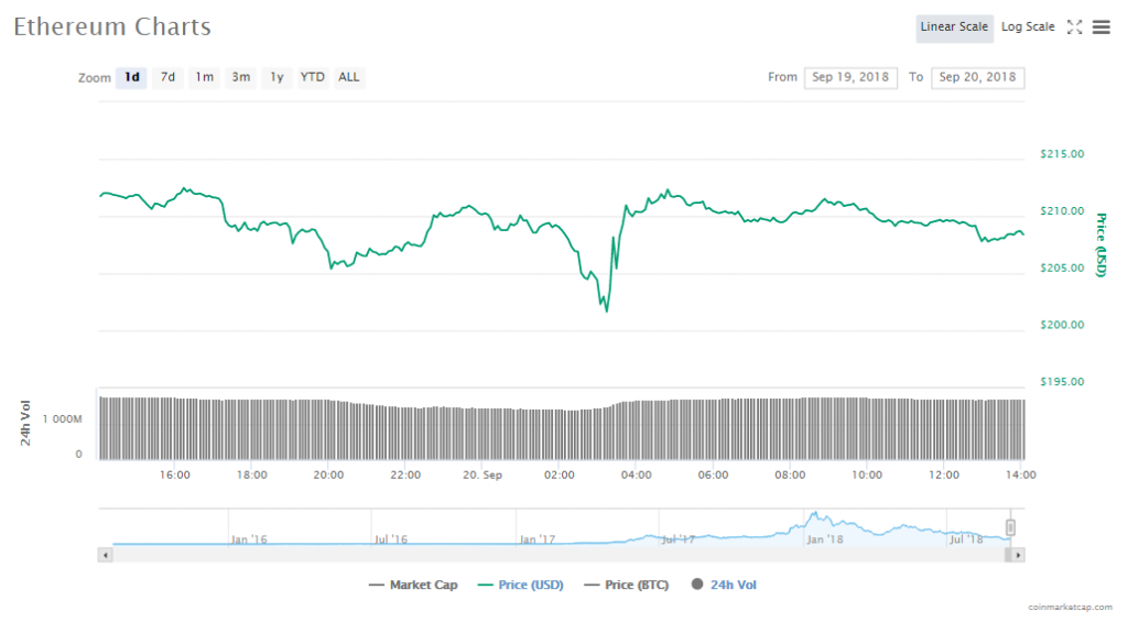 Ethereum’s trading price is $208.40, falling 1.46% since yesterday. The value of Ethereum is $21.25 billion and volumes in trade are $1.69 billion.