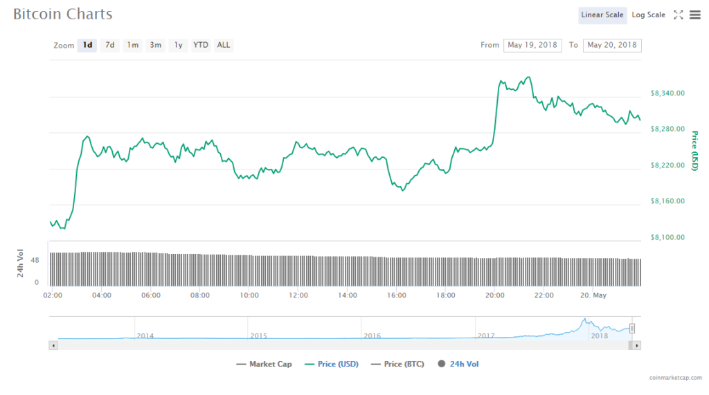 In the past 24 hours, Bitcoin jumped a notch by 1.78% to $8,305.81. The leading cryptocurrency’s trade volume trickled to $4.96 billion, while its market slid to $141.55 billion.