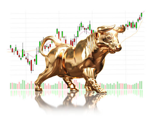 Golden bull on stock market data. Bull market on financial stock exchange market. 3d illustration